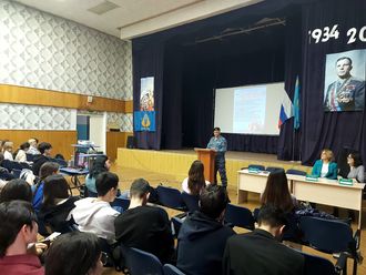 Представители УМВД России на комплексе «Байконур» рассказали ребятам о специфике прохождения службы в органах внутренних дел, преимуществах и перспективах дальнейшего поступления в высшие учебные заведения МВД. С большим интересом школьники просмотрели видеоматериал о ежедневной работе полицейских.